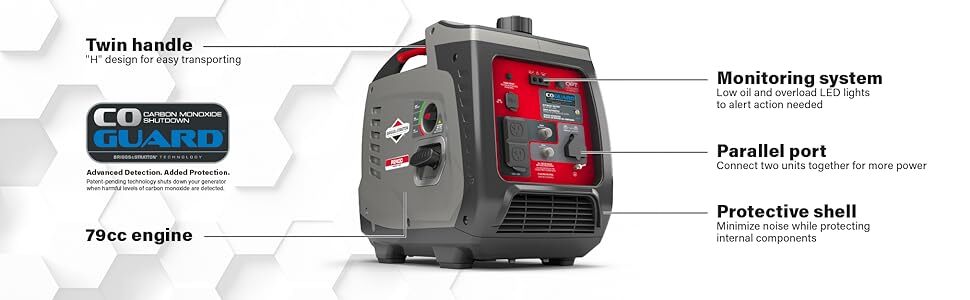The P3500 PowerSmart Series™ Inverter Generator by Briggs & Stratton takes portable power generation to the next level. Inverter technology makes it safer for sensitive electronics and computer controlled technology supplies smooth, steady power – and adjusts engine speed accordingly to suit your power needs and save fuel. Twin cushioned carrying handles or a retractable handle and wheels make it easy to move. Plus the on-board LCD StatStation® display keeps you informed about power use, run time and maintenance reminders. Now that’s smart power.